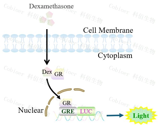 GRE-Luc HEK293 報告基因細胞,是由 GRE 調(diào)控并表達 Luc 熒光素酶 報告基因的 HEK293 細胞。Dexamethasone (Hexadecadrol,地塞米松)是糖皮質(zhì)激素受體 (Glucocorticoid Receptor)激動劑、凋亡誘導劑,原理見下圖所示。![]() Figure 1. GRE-Luc HEK293 細胞原理示意圖 |