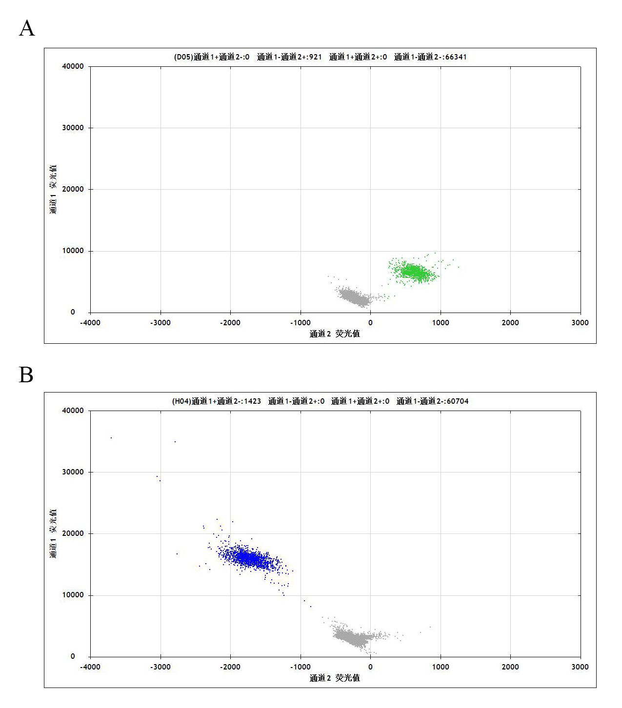 Figure 3. A:HCT116 Parental Cell;B:WRN[C727S](Homozygous,AF%:100) Isogenic HCT116 通道2 藍(lán)色微滴代表WRN[C727S]突變陽性,通道2 綠色微滴代表該位點(diǎn)為陰性野生型