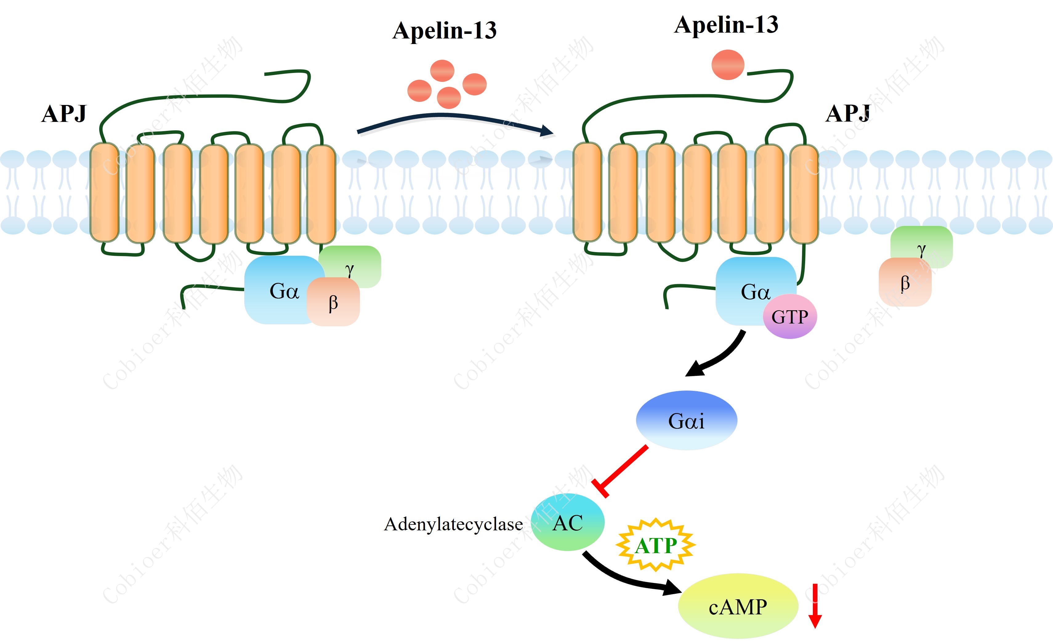 cAMP 在 G 蛋白偶聯(lián)受體(GPCR)信號轉(zhuǎn)導(dǎo)中是一種關(guān)鍵的第二信使。當(dāng)配體結(jié)合到 GPCR,構(gòu)象發(fā)生變化,激活受體接著激活G蛋白,Gi的激活導(dǎo)致腺苷酸環(huán)化酶調(diào)控 cAMP 的下調(diào)。APLNR(APJ)藥靶模型很好的模擬了體內(nèi) APLNR(APJ)的信號轉(zhuǎn)導(dǎo)過程,原 理見下圖所示。