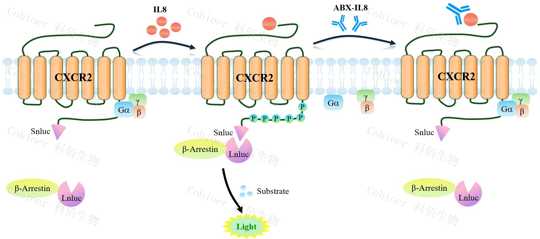 CXCR2 β-Arrestin CHO 報(bào)告基因藥靶模型很好的模擬了體內(nèi) CXCR2/β-Arrestin 的信號(hào)轉(zhuǎn)導(dǎo)過程,原理見下圖當(dāng)缺乏配體刺激時(shí),β-Arrestin 不與 CXCR2 結(jié)合,融合β- Arrestin 的熒光素酶處于失活構(gòu)象,當(dāng) CXCR2 遭遇配體刺激時(shí),融合熒光素酶報(bào)告基因的 β-Arrestin 被招募,使熒光素酶報(bào)告基因處于激活狀態(tài),加入其底物后發(fā)光信號(hào)增強(qiáng)。![]() Figure 1. CXCR2 β-Arrestin CHO 細(xì)胞模型原理圖 |
