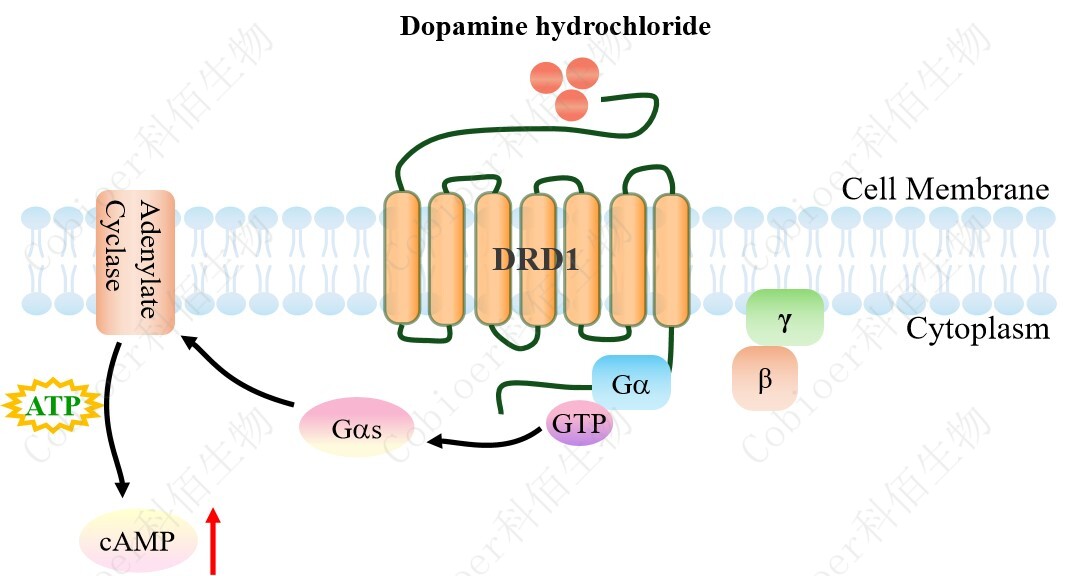 多巴胺(DA)是一種主要的兒茶酚胺神經(jīng)遞質,它與多巴胺受體(DRs)結合,因此 在中樞神經(jīng)系統(tǒng)(CNS)中起著重要作用,包括睡眠、工作記憶、情緒、學習等。DRs 是 由 DRD1、DRD2、DRD3、DRD4 和 DRD5 組成的 G 蛋白偶聯(lián)受體,根據(jù)它們對腺苷酸環(huán) 化酶(AC)活性的不同調節(jié)作用,分為 D1 樣受體(DRD1 和 DRD5)和 D2 樣受體(DRD 2、DRD3 和 DRD4)。 D1 樣受體與 Gs 偶聯(lián),其結合激活腺苷酸環(huán)化酶,增加 cAMP/PKA 級聯(lián)反應的激活。 由 D1 樣受體激活的信號級聯(lián)反應也可以通過調節(jié)轉錄對細胞功能產(chǎn)生長期影響。例如,D 1 樣受體激動劑會增加 cAMP 水平和 CREB 在 Ser133 位點的磷酸化,隨后調節(jié)了許多對各 種精神疾病的重要基因的轉錄。相關研究表明,一些 D1 激動劑的行為效應與 cAMP/PKA 信號傳導無關,而是涉及非 cAMP 介導的信號傳導,包括 PLC 介導的鈣升高。DA 可通過 作用于其受體來調節(jié)不同免疫細胞的激活和趨化性,從而充當免疫系統(tǒng)的重要調節(jié)劑。DR D1 是最豐富的多巴胺受體,在中樞神經(jīng)系統(tǒng)(CNS)中高度表達。DRD1 是治療許多 CNS 疾病的具有吸引力的靶點,還包括許多與認知能力下降相關的疾病。 |