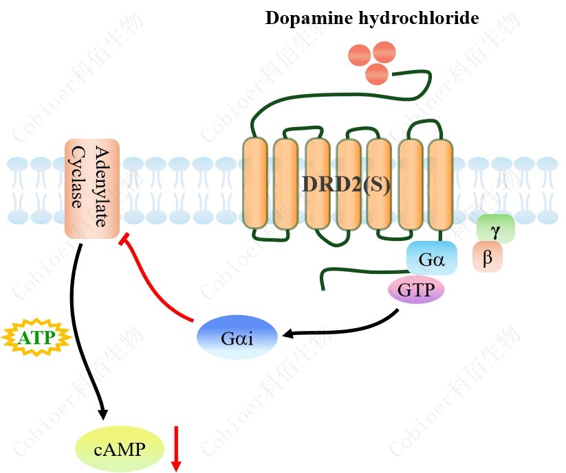 多巴胺(DA)是一種主要的兒茶酚胺神經(jīng)遞質(zhì),它與多巴胺受體(DRs)結(jié)合,因此 在中樞神經(jīng)系統(tǒng)(CNS)中起著重要作用,包括睡眠、工作記憶、情緒、學(xué)習(xí)等。DRs 是 由 DRD1、DRD2、DRD3、DRD4 和 DRD5 組成的 G 蛋白偶聯(lián)受體,根據(jù)它們對腺苷酸環(huán) 化酶(AC)活性的不同調(diào)節(jié)作用,分為 D1 樣受體(DRD1 和 DRD5)和 D2 樣受體 (DRD2、DRD3 和 DRD4)。D2 樣受體與 Go 和 Gi 蛋白偶聯(lián),它們參與 AC 的失活,導(dǎo) 致胞質(zhì)內(nèi) cAMP 水平降低。DA 與 D2 樣受體的結(jié)合抑制 cAMP/PKA 信號通路,最終影響 CREB 磷酸化。DRD2 基因有兩種剪接體,可產(chǎn)生不同長度(氨基酸數(shù))的受體,稱為 DRD2L 和 DRD2S。 | |