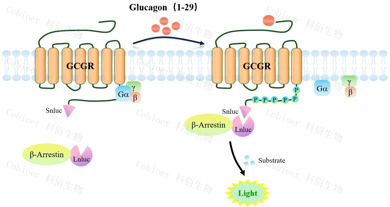 GCGR β-Arrestin CHO 報(bào)告基因藥靶模型很好的模擬了體內(nèi) GCGR/β-Arrestin 的信號(hào)轉(zhuǎn) 導(dǎo)過(guò)程,原理見下圖所示。當(dāng)缺乏配體刺激時(shí),β-Arrestin 不與 GCGR 結(jié)合,融合β- Arrestin 的熒光素酶處于失活構(gòu)象;當(dāng) GCGR 遭遇配體刺激時(shí),融合熒光素酶報(bào)告基因的β- Arrestin 被招募,使熒光素酶報(bào)告基因處于激活狀態(tài),加入其底物后發(fā)光信號(hào)增強(qiáng)。![]() Figure 1. GCGR β-Arrestin CHO 細(xì)胞模型原理圖 |