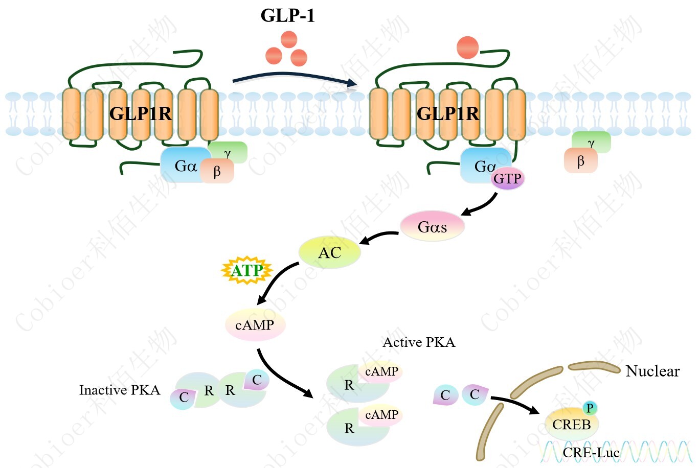 GLP1R CRE-Luc HEK293 報(bào)告基因藥靶模型很好的模擬了體內(nèi) GLP1R 的信號(hào)轉(zhuǎn)導(dǎo)過程,原理見下圖所示。 Figure 1. GLP1R CRE-Luc HEK293 細(xì)胞模型原理圖
