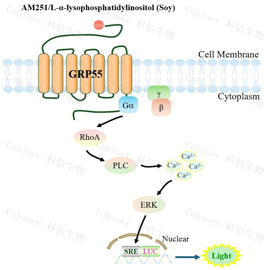 GPR55 Reporter Cell 藥靶模型很好的模擬了體內(nèi) GPR55 的信號轉(zhuǎn)導過程,原理見下圖所示。 ![]() Figure 1. GPR55 Reporter Cell 細胞模型原理圖 |