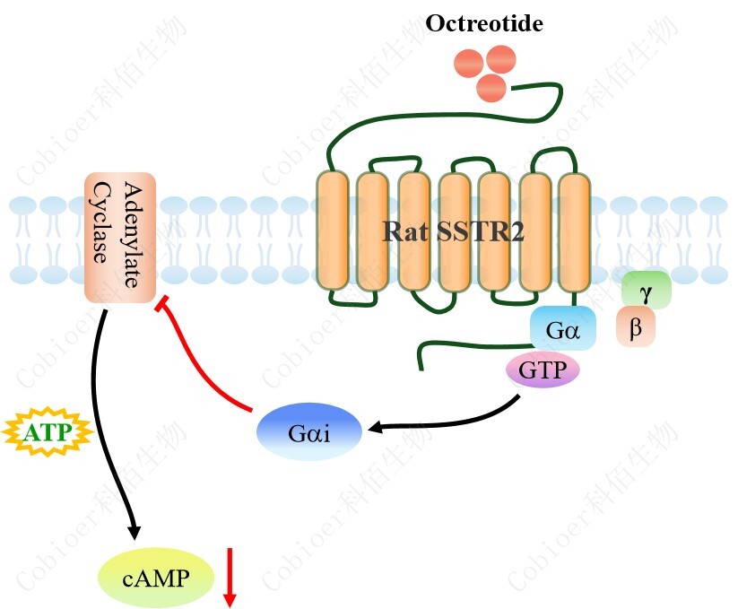生長(zhǎng)抑素受體(Somatostatin receptor,SSTRs)是 GPCR 超家族中的 class A 家族的成 員,共有 5 種亞型,分別為 SSTR1-SSTR5,其中 SSTR2 是唯一一種有 SSTR2a 和 SSTR2b 這 2 種異構(gòu)體的 SSTR 亞型受體蛋白。SSTR2 廣泛分布于正常組織中,如腦下垂體、胰島、 腎上腺、胸腺、胃腸道以及免疫系統(tǒng)等,在不同受體的組織,表達(dá)譜各不相同。 SSTR2 與其它同家族受體一樣,在結(jié)合內(nèi)源性多肽配體 SST 后可以與 Gi 蛋白偶聯(lián), 通過(guò)調(diào)節(jié)腺苷酸環(huán)化酶活性進(jìn)而抑制環(huán)腺苷酸的合成,將外源信號(hào)傳遞至胞內(nèi),從而參與 調(diào)節(jié)多種激素的分泌,抑制細(xì)胞生長(zhǎng)增殖。SSTR 還能激活 K+通道,促進(jìn)細(xì)胞膜超極化, 抑制門(mén)控 Ca 2+通道的激活,進(jìn)而阻礙 Ca 2+ 內(nèi)流,抑制胞吐,抑制荷爾蒙的分泌功能。當(dāng) SSTR2 或其它亞型與 SST 結(jié)合后,可以通過(guò)蛋白酪氨酸磷酸途徑,SSTR 導(dǎo)致蛋白酪氨酸 磷酸酶(PTP)上調(diào),使酪氨酸激酶去磷酸化而失活,并抑制促絲裂原活化蛋白激酶 (MAPK)等多種蛋白激酶,抑制癌基因、c-fos、c-mys、c-jun 等轉(zhuǎn)錄激活,從而抑制 DNA 和蛋白質(zhì)的合成。SSTR2 在神經(jīng)母細(xì)胞瘤、垂體腺瘤、黑色素瘤、甲狀腺癌以及許多 神經(jīng)內(nèi)分泌腫瘤中高表達(dá)。 |