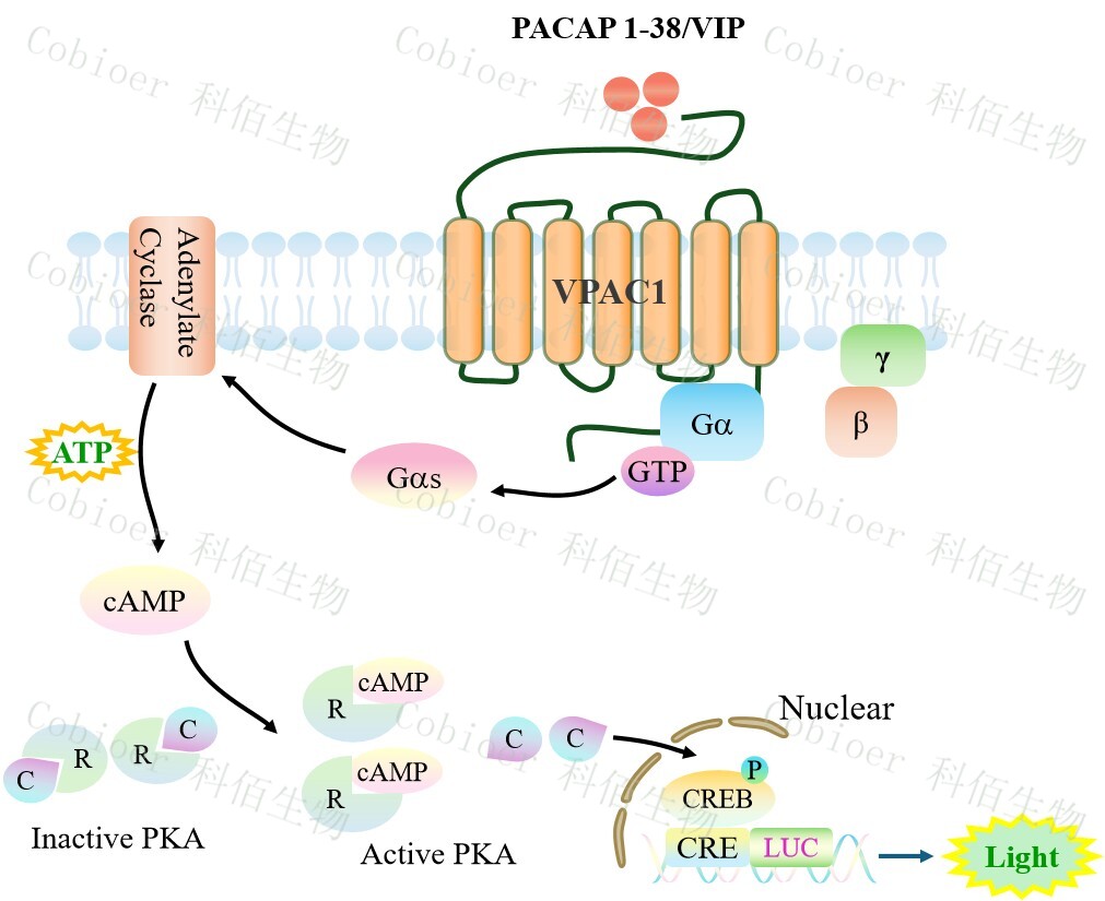 VPAC1 CRE-Luc HEK293 報告基因藥靶模型很好的模擬了體內(nèi) VPAC1 的信號轉導過程,原理見下圖所示。![]() Figure 1. VPAC1 CRE-Luc HEK293 細胞模型原理圖 |