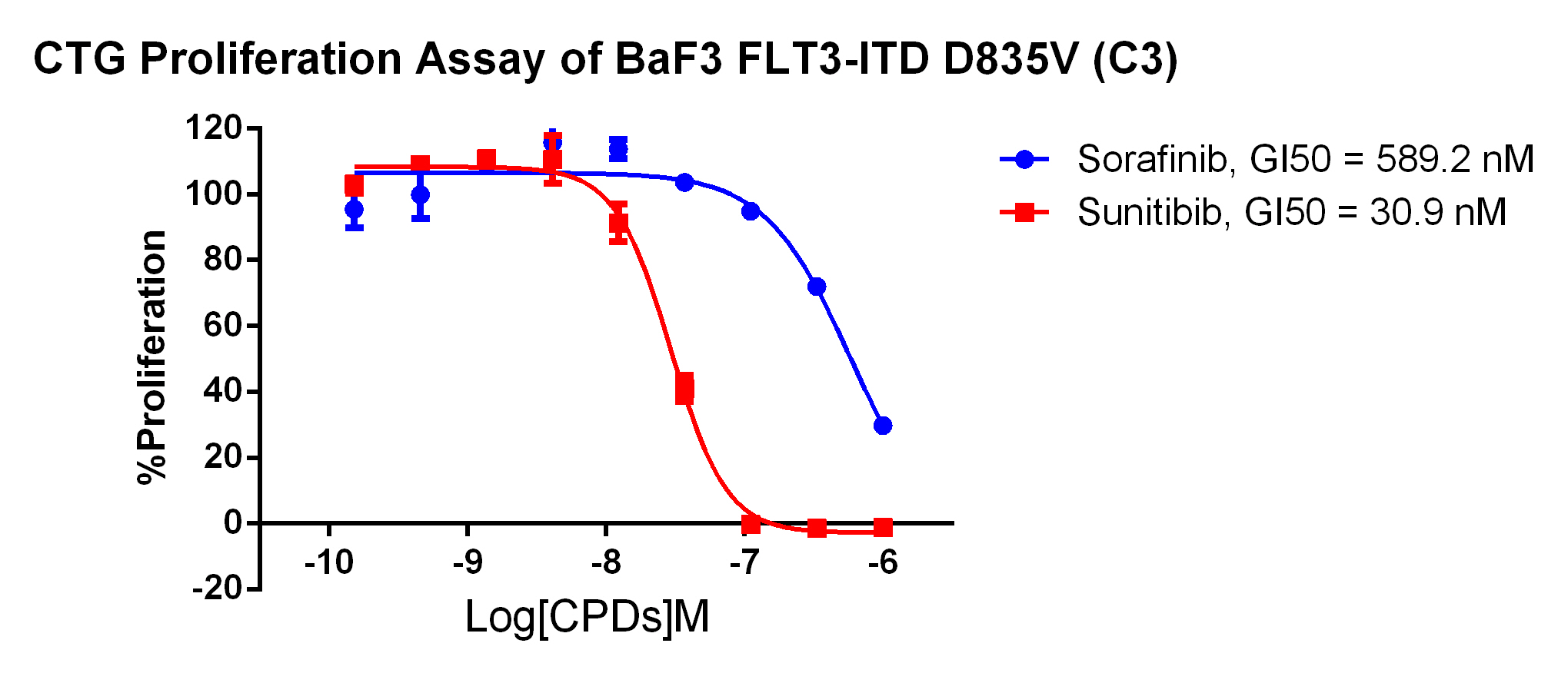 Figure . Anti-proliferation assay of two reference compounds on the FLT3-ITD [D835V]/BaF3 Stable Cell Line.