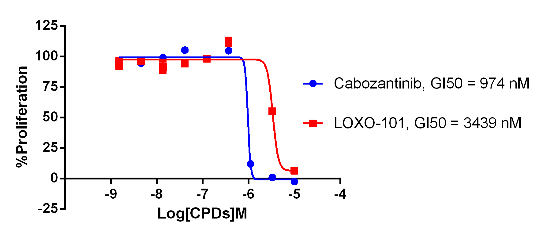 2.Anti-proliferation assay Figure 3. Anti-proliferation assay of two reference compounds on the ETV6-NTRK3-G623R/BaF3 Stable Cell Line. |