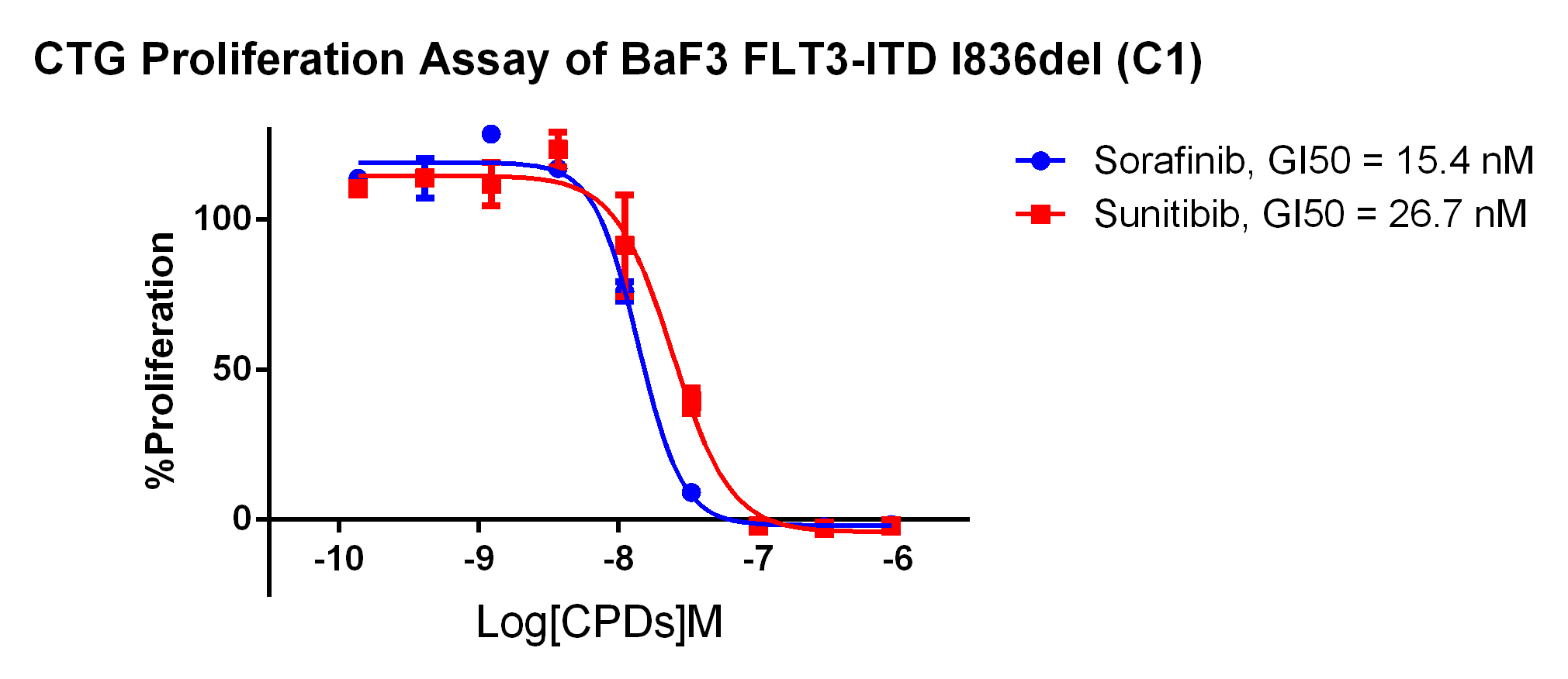 Figure . Anti-proliferation assay of two reference compounds on the FLT3-ITD [I836del]/BaF3 Stable Cell Line.