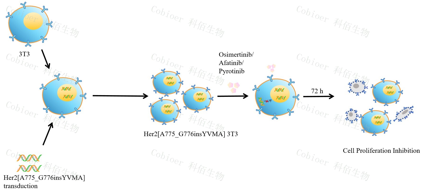 HER2[A775_G776insYVMA] 3T3 藥靶細(xì)胞,通過(guò)轉(zhuǎn)導(dǎo)突變狀態(tài)的 HER2[A775_G776insYVMA] 基因到 3T3 細(xì)胞系中 , 穩(wěn)定表達(dá)人突變形態(tài)下的 HER2[A775_G776insYVMA]基因,原理及流程見(jiàn)下圖所示。![]() Figure 1. HER2[A775_G776insYVMA] 3T3 細(xì)胞的構(gòu)建原理圖 |
