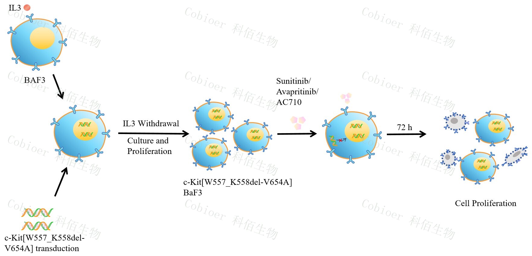 | c-Kit[W557_K558del-V654A] BaF3 藥靶細(xì)胞,通過(guò)轉(zhuǎn)導(dǎo)突變狀態(tài)的 c- Kit[W557_K558del-V654A] 基 因 到 BaF3 細(xì) 胞 系 中 , 穩(wěn) 定 表 達(dá) 人突變形態(tài)下的 c- Kit[W557_K558del-V654A] 基因。 BaF3(小鼠原 B 細(xì)胞)的生長(zhǎng)和增殖需要 IL-3 的維持。通過(guò)引入各種表達(dá)激酶的基因, 能作為 BaF3 的驅(qū)動(dòng)基因,讓 BaF3 不再依賴(lài) IL-3 而增殖,進(jìn)而激酶基因成為 BaF3 增殖依 賴(lài)的驅(qū)動(dòng)基因,用于評(píng)估小分子藥物對(duì)激酶的靶向抑制作用,原理及流程見(jiàn)下圖所示。 ![]() Figure 1. c-Kit[W557_K558del-V654A] BaF3 細(xì)胞的構(gòu)建原理圖 |