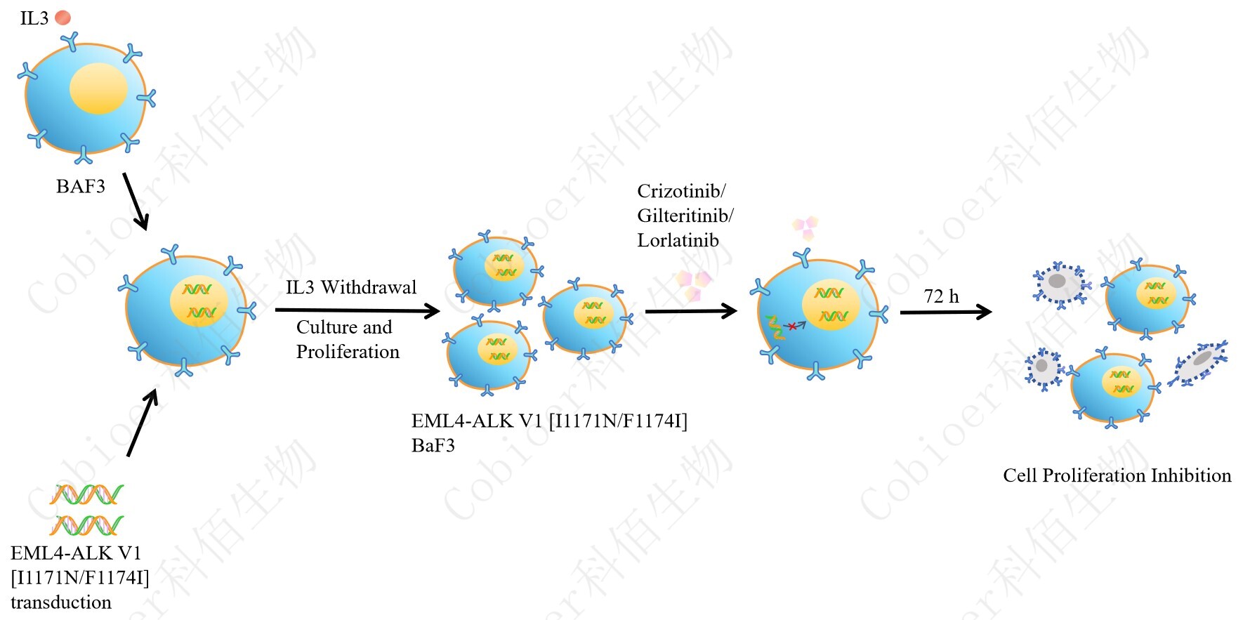 BaF3(小鼠原 B 細胞)的生長和增殖需要 IL-3 的維持。通過引入各種表達激酶的基因, 能作為 BaF3 的驅(qū)動基因,讓 BaF3 不再依賴 IL-3 而增殖,進而激酶基因成為 BaF3 增殖依 賴的驅(qū)動基因,用于評估小分子藥物對激酶的靶向抑制作用,原理及流程見下圖所示。