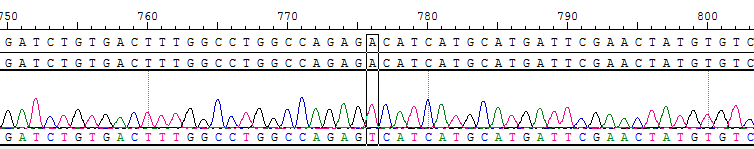 1.Sanger of PDGFRA D842V-V658A/BaF3 Figure 1. PDGFRA D842V-V658A/BaF3 V658A Figure 2. PDGFRA D842V-V658A/BaF3 D842V |