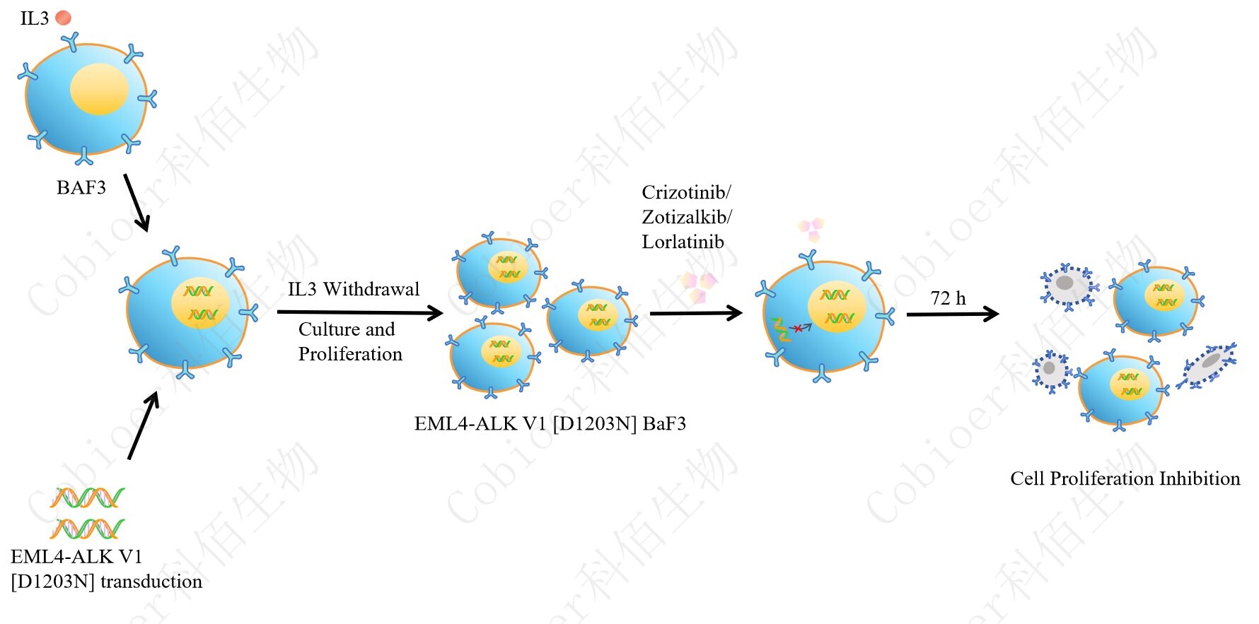 BaF3(小鼠原 B 細(xì)胞)的生長和增殖需要 IL-3 的維持。通過引入各種表達(dá)激酶的基因, 能作為 BaF3 的驅(qū)動(dòng)基因,讓 BaF3 不再依賴 IL-3 而增殖,進(jìn)而激酶基因成為 BaF3 增殖依 賴的驅(qū)動(dòng)基因,用于評(píng)估小分子藥物對激酶的靶向抑制作用,原理及流程見下圖所示。