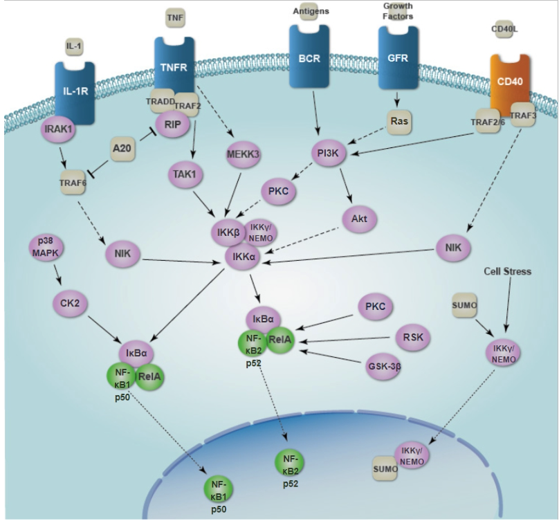 Description: | pNFkB-Luc is designed for monitoring the activation of the nuclear factor of kappa light polypeptide gene enhancer in B-cells (NFkB) signal transduction pathway. NFKB is a transcription regulator that is activated by various intra- and extra-cellular stimuli such as cytokines, oxidant-free radicals, ultraviolet irradiation, and bacterial or viral products. Activated NFKB translocates into the nucleus and stimulates the expression of genes involved in a wide variety of biological functions. |