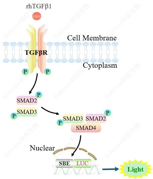 SBE-Luc HEK293 報告基因細(xì)胞,是由 SBE 調(diào)控并表達(dá) Luc 熒光素酶報 告基因的 HEK293 細(xì)胞。TGF-β與受體結(jié)合,激活 SBE 的原理見下圖所示。