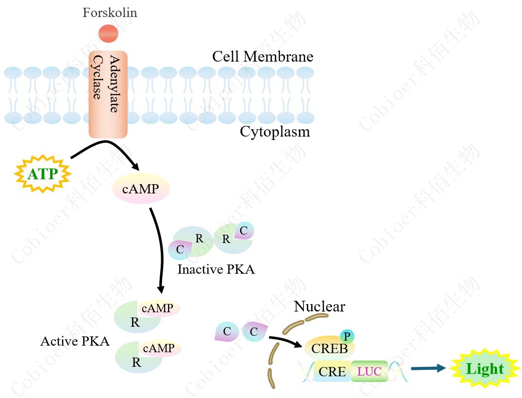 CRE-Luc HEK293 報告基因細(xì)胞是由 CRE 調(diào)控并表達(dá) Luc 熒光素酶報告基因的 HEK293 細(xì)胞。Forskolin 是天然存在的直接腺苷酸環(huán)化酶(AC)/cAMP/CREB 的 激活劑,原理見下圖所示。![]() Figure 1:CRE-Luc HEK293 原理示意圖 |