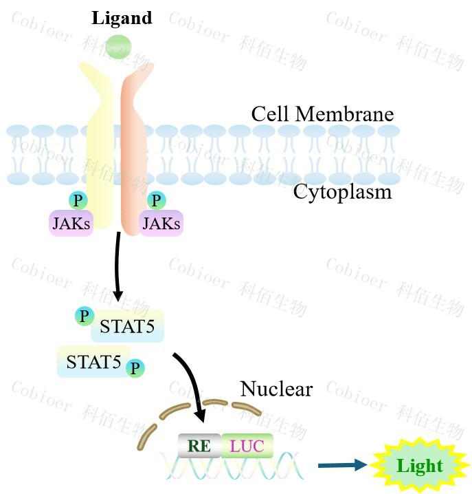 STAT5-Luc BaF3 報告基因細胞,是由 STAT5 調(diào)控并表達 Luc 熒光素酶 報告基因的 BaF3 細胞。IL3 與受體結合,激活 STAT5 的原理見下圖所示。![]() Figure 1. STAT5-Luc BaF3 細胞模型原理圖 |