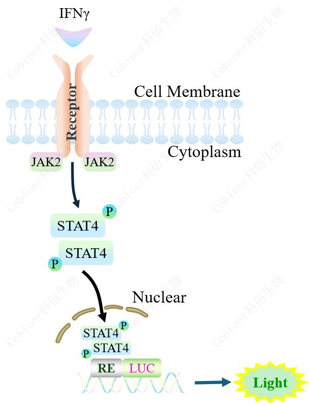 STAT4-Luc HEK293 報(bào)告基因細(xì)胞,是由 STAT4 調(diào)控并表達(dá) Luc 熒光素 酶報(bào)告基因的 HEK293 細(xì)胞。IFNγ與受體結(jié)合,激活 STAT4 的原理見(jiàn)下圖所示。