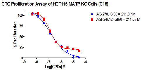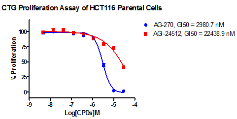 3. Anti-proliferation assay Figure 3. CTG Proliferation Assay of HCT116 MTAP KO cells. Figure 4. CTG Proliferation Assay of HCT116 Parental cells. |