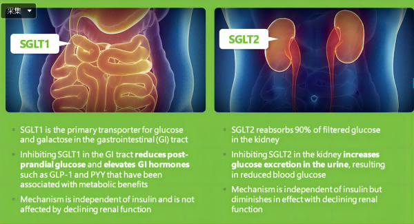 Sotagliflozin是口服的鈉-葡萄糖協(xié)同轉(zhuǎn)運蛋白1型和2型(SGLT1和SGLT2)的雙重抑制劑。SGLT1負責(zé)胃腸道中的葡萄糖吸收,對SGLT1的抑制可抑制消化道對葡萄糖和半乳糖的吸收;而SGLT2負責(zé)腎臟對葡萄糖的重吸收,對SLGT2抑制則是減少腎小管對葡萄糖的重吸收。