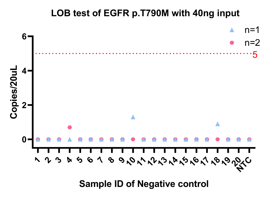 首先使用EGFR T790M的對應(yīng)的陰性標(biāo)準(zhǔn)品,對50%的標(biāo)準(zhǔn)品進(jìn)行有限稀釋,每個梯度使用陰性樣本兩倍稀釋,接著對11個樣本進(jìn)行檢測。