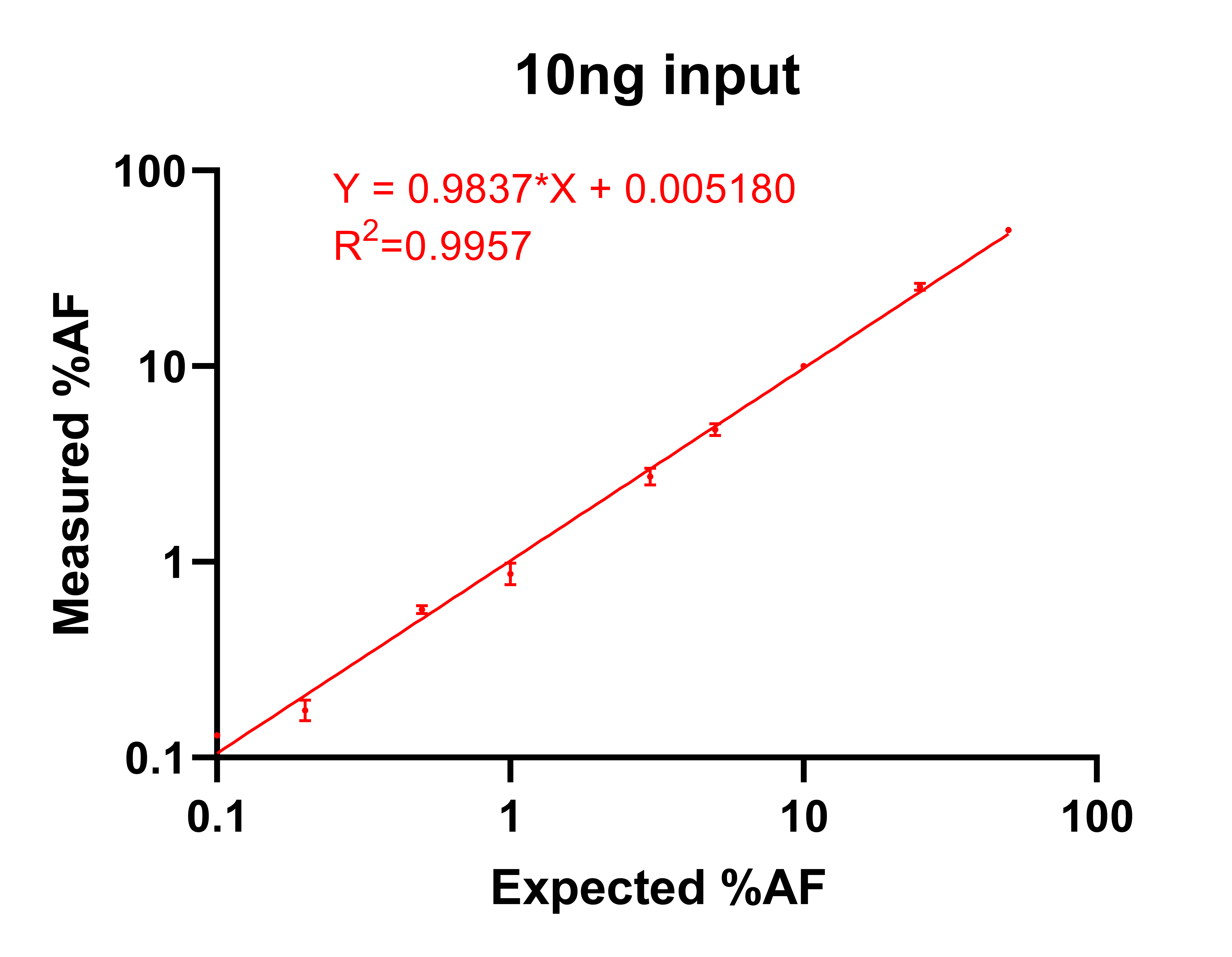 根據(jù)以上結(jié)論,我們選取10ng作為進(jìn)一步的%AF線性范圍探索,首先使用EGFR T790M的對應(yīng)的陰性標(biāo)準(zhǔn)品,對50%的標(biāo)準(zhǔn)品進(jìn)行有限稀釋,0.1%-50%間設(shè)置9個AF梯度,進(jìn)行數(shù)字PCR檢測(2復(fù)孔)。