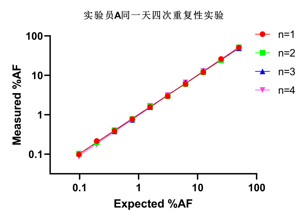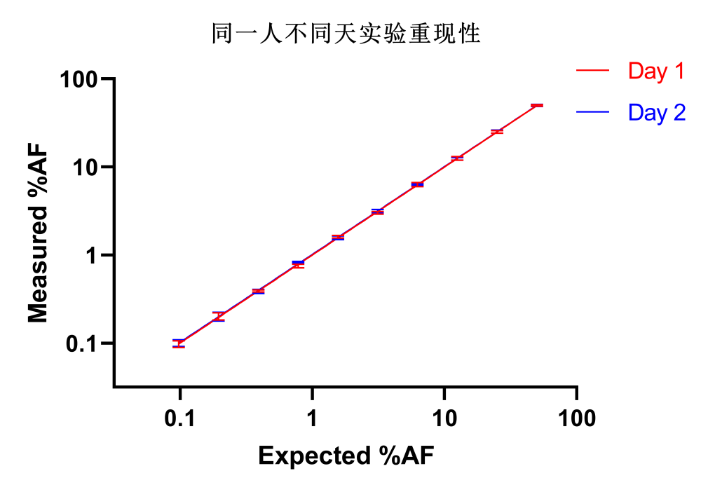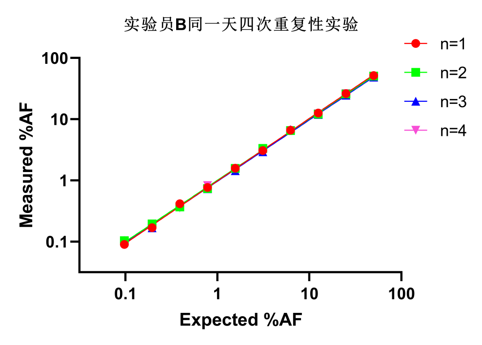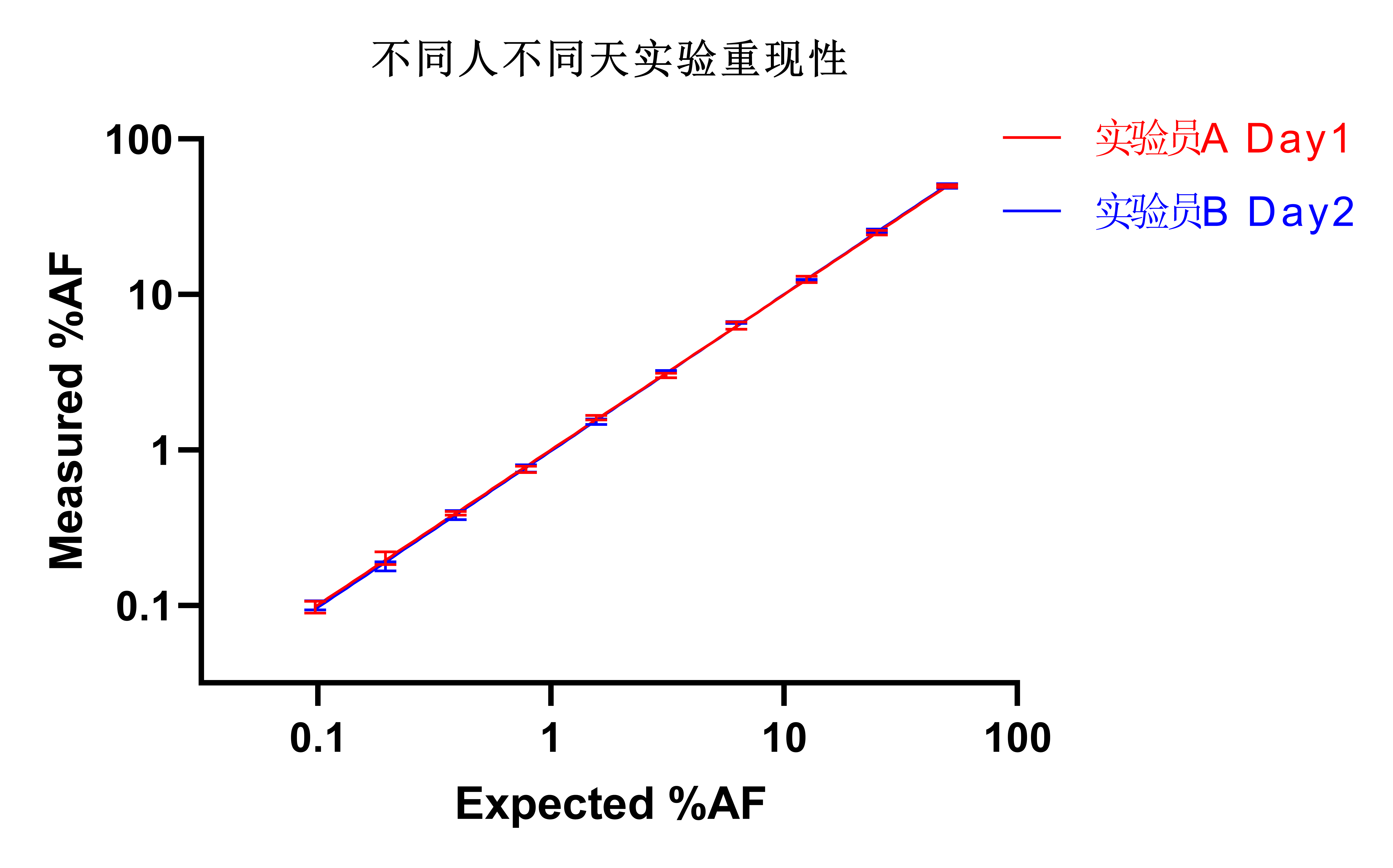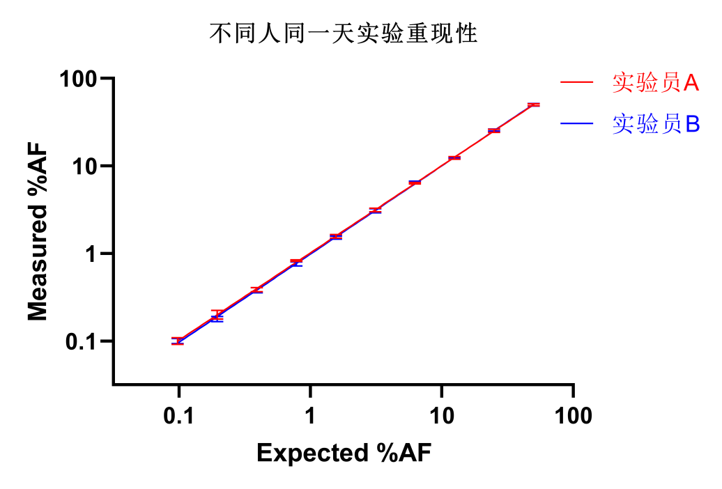 取10個不同AF(1%~50%)的標(biāo)準(zhǔn)品樣本,分別安排①實驗員A、實驗員B在同一天進(jìn)行每人四次實驗測試;②實驗員A在第一天、第二天分別進(jìn)行四次實驗測試;③實驗員A在第一天進(jìn)行四次實驗測試,實驗員B在第二天進(jìn)行四次實驗測試。