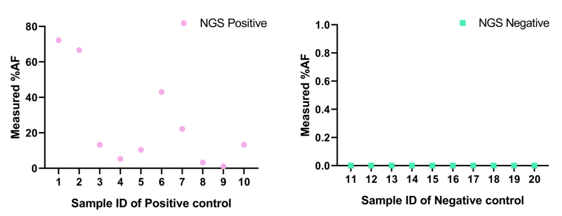 ①測試10個NGS陽性樣本,檢測結(jié)果均為陽性,陽性符合率100%,并定量檢出變異頻率。