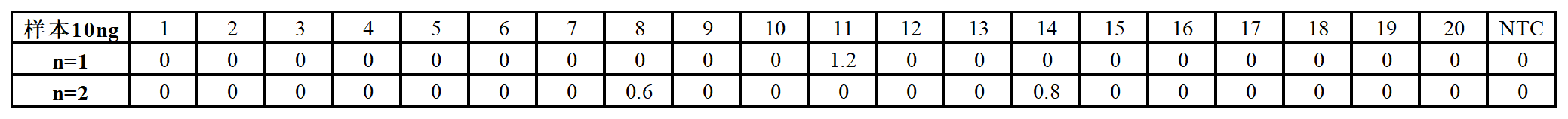 待測樣本:10個NGS驗證為陽性的樣本(編號1-10);  10個NGS驗證為陰性的樣本(編號11-20)。對20個樣本分別使用數(shù)字PCR檢測。