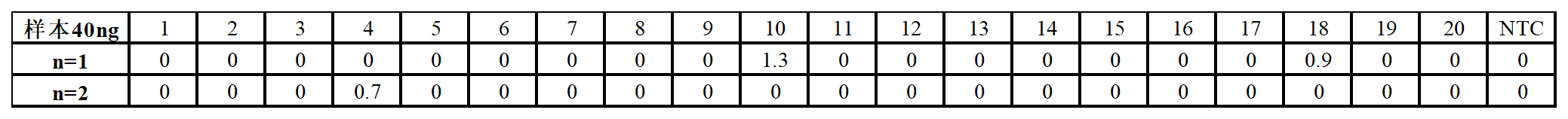 待測樣本:20個陰性樣本和1個NTC。分別將投入量設(shè)置為10ng和40ng,每個樣本做兩個重復(fù)進(jìn)行Bio-Rad數(shù)字PCR檢測。