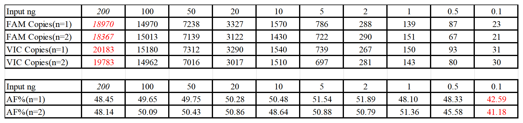 1.2 投入量在0.1ng~200ng間設(shè)置10個梯度,進(jìn)行數(shù)字PCR檢測(2復(fù)孔),判斷是否滿足%AF=50±10%波動。