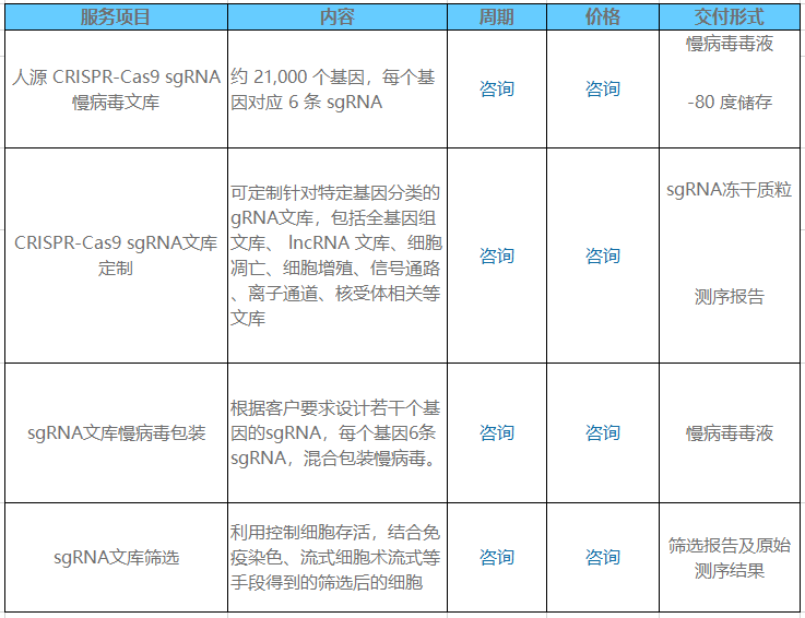 · 為客戶提供從sgRNA文庫設(shè)計、芯片Oligo引物合成、文庫構(gòu)建及慢病毒包裝到篩選的一站式基因功能篩選服務(wù)。
