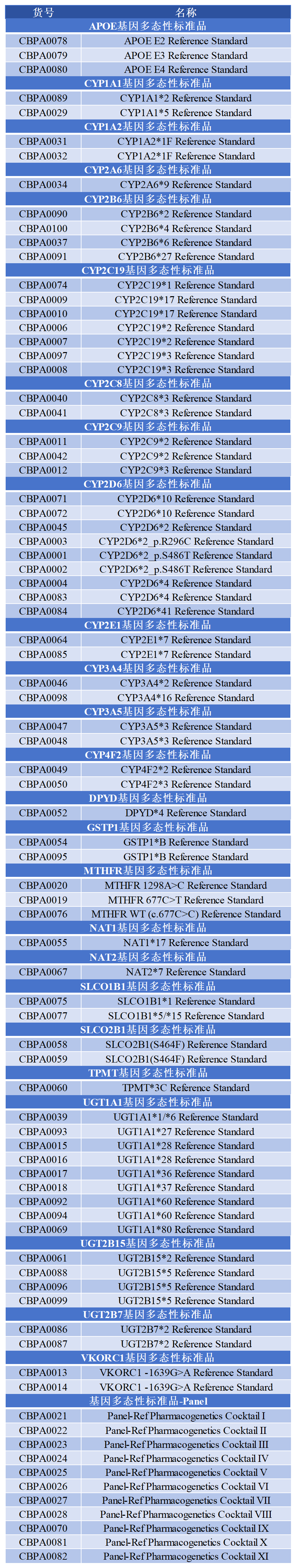 科佰生物目前可提供近百種用藥指導的質控單品及混合質控盤,涵蓋APOE、CYP1A1、CYP2A6、CYP2B6、CYP2C19、CYP2C8、CYP2C9、CYCP2D6、CYP2E1、CYP3A4、CYP3A5、CYP4F2、DPYD、GSTP1、MTHFR、NAT1、NAT2、SLCO1B1、TPMT、UGT1A1、UGT2B15、UGT2B7、VKORC1等多個藥物代謝基因,可在全流程對檢測過程進行監(jiān)控,幫助實現(xiàn)個體化用藥基因檢測的精準性。