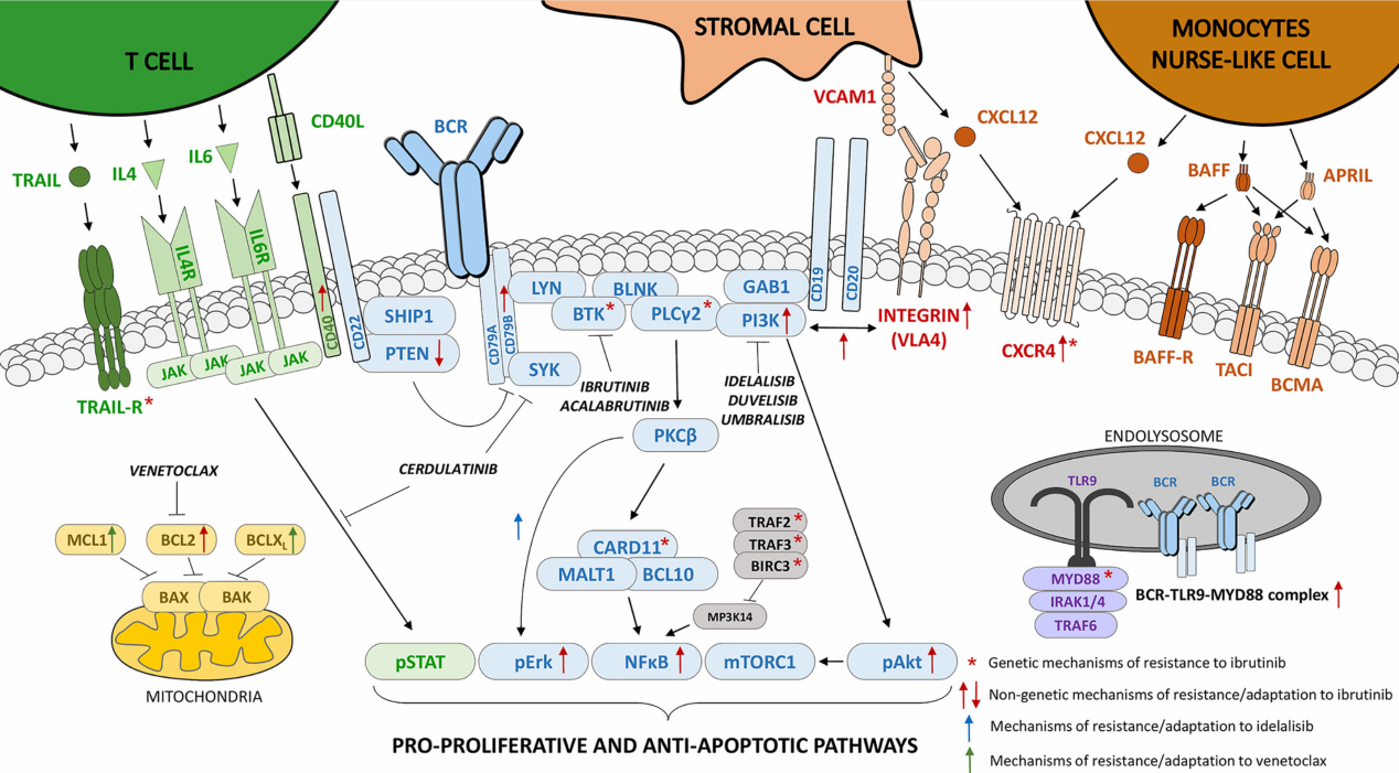 B細(xì)胞受體(BCR)信號通路在成熟B細(xì)胞惡性腫瘤的發(fā)生和進(jìn)展中起著核心作用,例如慢性淋巴細(xì)胞白血?。–LL)、套細(xì)胞淋巴瘤(MCL)、彌漫性大B細(xì)胞淋巴瘤(DLBCL)、濾泡性淋巴瘤(FL)或華氏巨球蛋白血癥(WM)。BCR信號通路中的激活突變常見于DLBCL、FL或WM;而在CLL和MCL中一般會缺失,但BCR信號轉(zhuǎn)導(dǎo)被組成性激活,并且是其發(fā)病機(jī)制的關(guān)鍵參與者。
