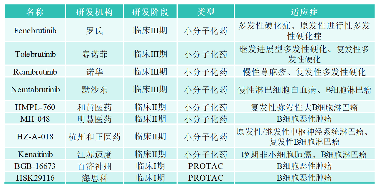 2013年,第一代BTK抑制劑Ibrutinib(伊布替尼)已被批準(zhǔn)用于治療 CLL、MCL、WM 和邊緣區(qū)淋巴瘤 (MZL),它與BTK活性位點(diǎn)的半胱氨酸殘基形成共價(jià)鍵,封閉了ATP結(jié)合口袋,從而阻斷BTK的酶活性。雖然它是一種強(qiáng)效藥物,但它存在脫靶效應(yīng),并且相當(dāng)多的患者對治療產(chǎn)生耐藥性或毒性而停止治療。第二代的BTK抑制劑(如Acalabrutinib等)在保持高選擇性的同時(shí),減少了脫靶效應(yīng),提高了安全性和療效。但第一代和第二代的抑制劑都屬于不可逆抑制劑。BTK共價(jià)抑制劑治療后常會產(chǎn)生耐藥,部分耐藥機(jī)制為BTK 基因產(chǎn)生耐藥突變導(dǎo)致,其中最常見的耐藥突變?yōu)镃481位的氨基酸突變?yōu)镾。Pirtobrutinib是由禮來研發(fā)的首款獲批上市的非共價(jià)的第三代BTK抑制劑,它通過非共價(jià)、非C481依賴的結(jié)合阻斷BTK的ATP結(jié)合位點(diǎn),從而克服由C481S導(dǎo)致的共價(jià)BTK抑制劑耐藥機(jī)制,另外包括fenebrutinib,Nemtabrutinib等也屬于同一類型的三代非共價(jià)抑制劑。除了上述共價(jià)或非共價(jià)BTK抑制劑外,為了進(jìn)一步提高藥效和克服耐藥,近年來一些藥企也在開發(fā)針對BTK靶點(diǎn)的PROTAC藥物,下表為部分在研的BTK抑制劑以及PROTAC藥物。