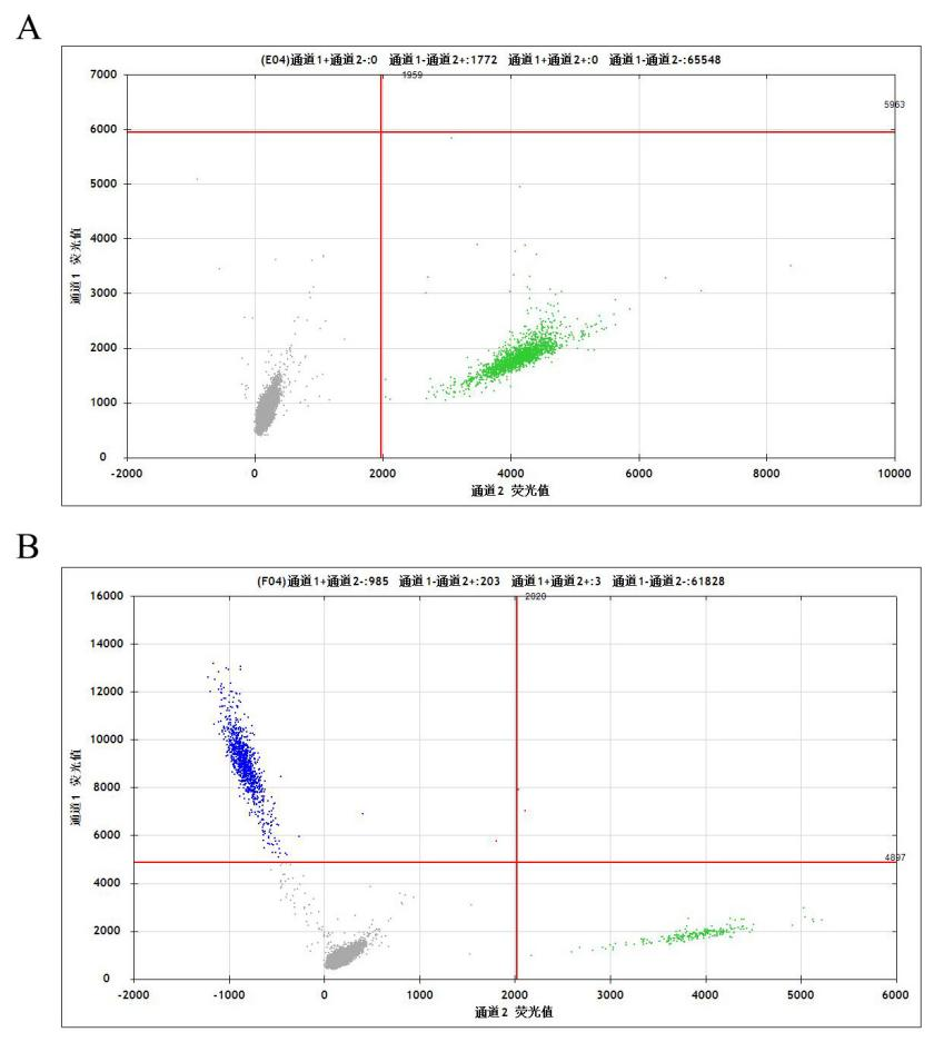 Figure 4:Gene Edited BTK[C481S] Isogenic Cell-ddPCR結(jié)果(通道1 藍(lán)色微滴代表BTK C481S 突變陽性,通道2 綠色微滴代表該位點(diǎn)為陰性野生型)