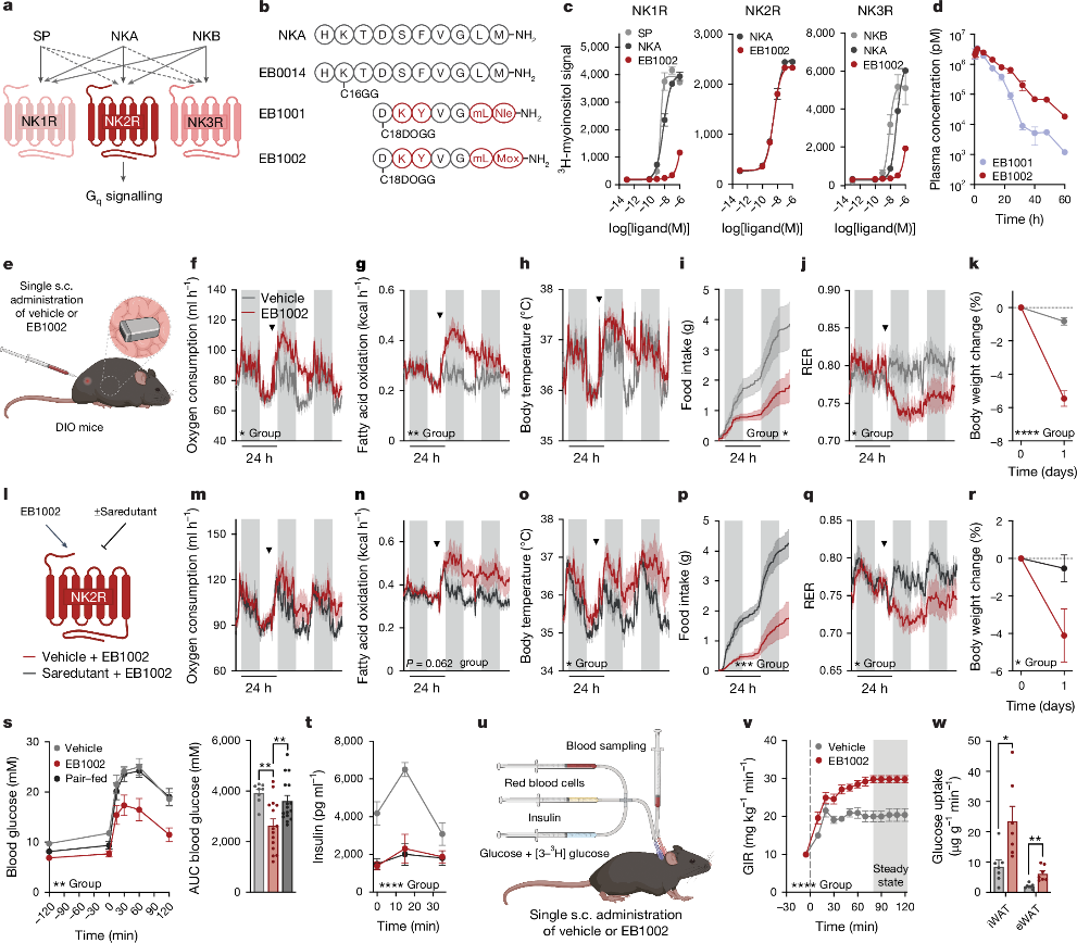 在文章研究部分,科研人員對(duì)肥胖模型小鼠注射了一種NK2R的天然配體激動(dòng)劑后發(fā)現(xiàn)這些肥胖小鼠體重在短期明顯下降,分析結(jié)果表明小鼠的能量消耗顯著增加,食物攝入下降約20%,且該代謝效應(yīng)并不依賴于瘦素(Leptin)信號(hào)通路。此外,科研人員發(fā)現(xiàn)優(yōu)化后的NK2R激動(dòng)劑EB1002不僅使小鼠在單次注射后的7天內(nèi)體重持續(xù)下降約15%,還能提高小鼠對(duì)胰島素的敏感性,促進(jìn)白色脂肪組織攝取葡萄糖,且能激活下丘腦弓狀核和室旁核神經(jīng)元來(lái)抑制因瘦素或黑皮質(zhì)素4受體缺失引起的高食欲狀態(tài)。這個(gè)結(jié)果表明該靶點(diǎn)可能在抗肥胖領(lǐng)域中,遠(yuǎn)比合并糖尿病的肥胖具有更廣泛的應(yīng)用前景。