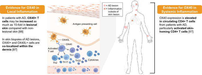 有研究證明OX40通路的激活參與了AD患者的全身和局部炎癥(如下圖所示)。雖然OX40L的表達(dá)(主要是單核細(xì)胞)在AD患者和健康對(duì)照組之間沒(méi)有差異,但在AD患者循環(huán)CD4+ T細(xì)胞中OX40的表達(dá)升高。在AD患者的外周血中,活化的CD4+ T細(xì)胞上OX40的表達(dá)比未表達(dá)抗原的活化CD4+ T細(xì)胞上OX40的表達(dá)增加。AD患者病變皮膚中OX40+細(xì)胞(可能是T細(xì)胞)和OX40L+樹(shù)突狀細(xì)胞的數(shù)量比銀屑病和非病變皮膚多。一項(xiàng)研究表明,在AD患者中,皮損皮膚中OX40+ T細(xì)胞比非皮損皮膚增加了10倍之多。在AD病變的皮膚活檢中,發(fā)現(xiàn)OX40+真皮細(xì)胞和OX40L+細(xì)胞(可能是肥大細(xì)胞)在真皮內(nèi)共定位,在角質(zhì)形成細(xì)胞上可見(jiàn)OX40L的表達(dá),提示OX40信號(hào)的局部活性。