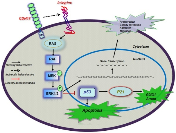 另有研究結果表明,CDH17間接影響整合素以穩(wěn)定其結構和活性。在人胃癌細胞MGC-803,CDH17過表達能夠激活Ras/Raf/MEK/ERK信號通路,促進細胞在體內(nèi)的致瘤性。