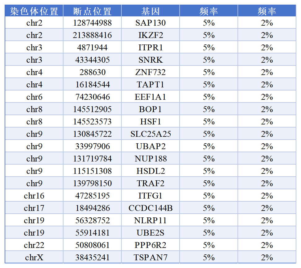 目前檢測ISA的方法有LM-PCR、NGS、單細胞測序等,為了保證檢測的準確性,科佰生物開發(fā)了一系列慢病毒整合位點標準品供檢測機構使用,作為品質衡量的標尺對檢測能力進行判別。在前文 慢病毒整合位點標準品強勢來襲一文中,已對單克隆多插入位點、單克隆單插入位點、性染色體插入位點 做了產(chǎn)品的說明及數(shù)據(jù)展示。近期科佰推出了5% 2% 整合頻率的慢病毒多克隆多整合位點參考品,由多個單克隆整合位點產(chǎn)品混合而來,覆蓋20個插入位點,分別來自11個不同染色體上的20個基因,如下表所示