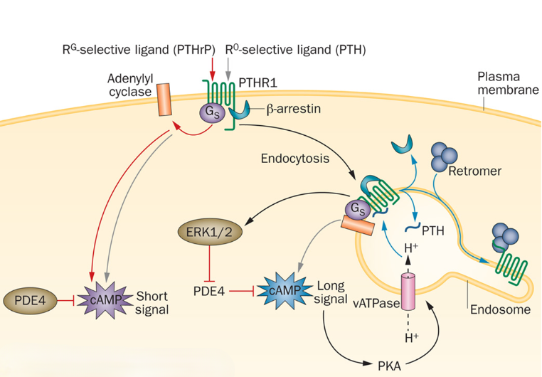 PTH1R與β-arrestin(特別是β-arrestin-1)結(jié)合后,可激活ERK-1/2/MAPK通路,延長(zhǎng)cAMP信號(hào)的持續(xù)時(shí)間,并促進(jìn)細(xì)胞外信號(hào)響應(yīng)。內(nèi)體信號(hào)傳導(dǎo)的終止與逆轉(zhuǎn)錄聚體分選蛋白的 β-抑制素復(fù)合物交換相關(guān),并受到 vATP 酶介導(dǎo)的囊泡酸化的促進(jìn)。vATP酶被cAMP依賴性PKA激活,從而建立負(fù)反饋回路。PTH1R 激活細(xì)胞內(nèi)持續(xù)時(shí)間和起源位置不同的 cAMP 信號(hào)傳導(dǎo)為配體定向的細(xì)胞反應(yīng)多樣化提供了潛在機(jī)制。這一通路既可通過(guò)G蛋白依賴途徑,也可通過(guò)G蛋白非依賴的β-arrestin直接激活。值得注意的是,β-arrestin依賴性信號(hào)在骨代謝中具有獨(dú)特作用,例如通過(guò)β-arrestin介導(dǎo)的ERK激活,促進(jìn)成骨細(xì)胞合成代謝,且不刺激骨吸收,對(duì)于骨的合成代謝發(fā)揮獨(dú)特的生理功能。