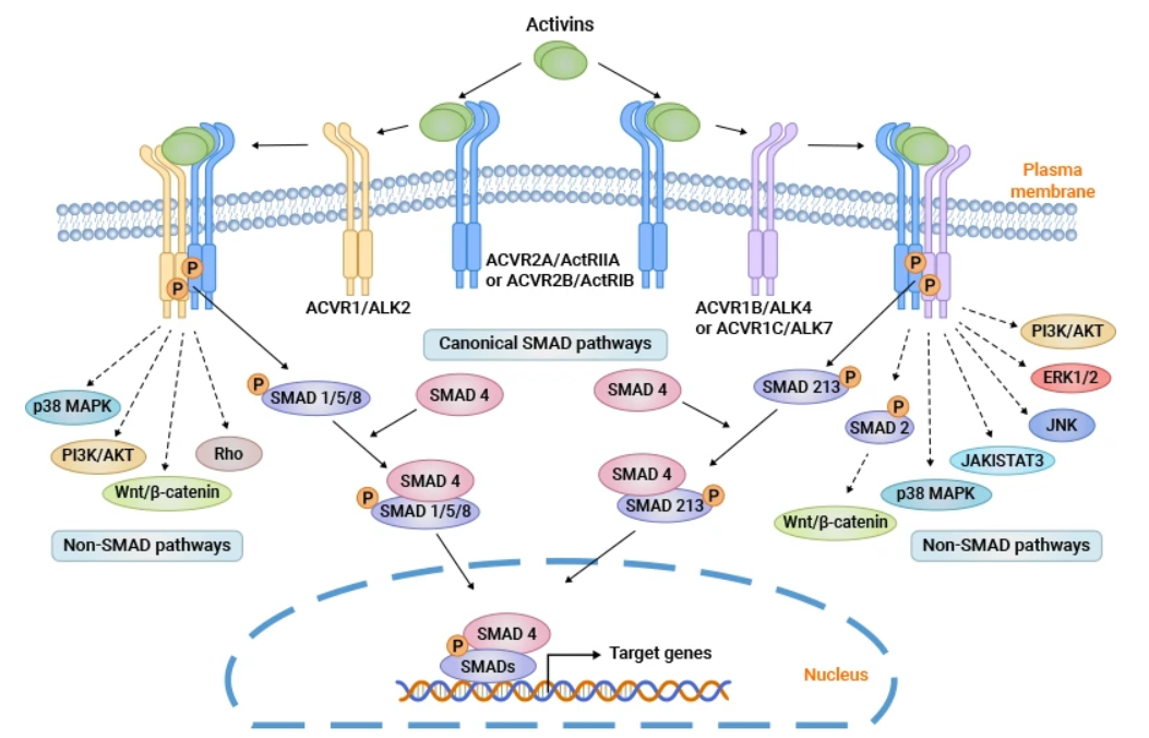 Activin A是一種約25 kDa的細(xì)胞因子,可通過二硫鍵與βA和/或 βB 亞基連接形成同源二聚體或異二聚體。Activin A通過兩個I型和兩個II型受體發(fā)出信號,配體結(jié)合后,組裝最終的受體復(fù)合物。I型受體包括激活素受體1A型(或激活素受體樣激酶2,ALK2)、激活素受體1B型(或ALK4)和激活素受體1C型(或ALK7)。II型受體(ActRII)分為激活素受體IIA型(ACVR2A)和激活素受體IIB型(ACVR2B)。
