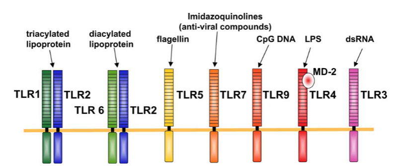 Toll樣受體(Toll like receptors,簡稱TLRs)是一類介導(dǎo)炎癥和先天性免疫的受體。TLRs是最早發(fā)現(xiàn)和最具特征性的模式識別受體,廣泛分布在巨噬細(xì)胞、樹突狀細(xì)胞等免疫細(xì)胞中,另外,還存在于像心肌細(xì)胞這樣的組織細(xì)胞中。