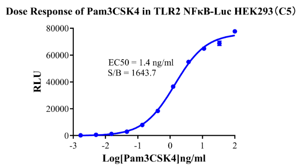 Figure 3.Detect Luciferase assay by Ultra Luciferase Detection Kit CBPH0001(we strongly suggest to purchase from Cobioer). Dose Response of Pam3CSK4 in TLR2 NFκB-Luc HEK293(C5).