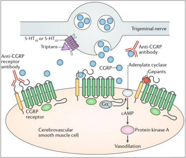 降鈣素基因相關肽(calcitonin gene-related peptid,CGRP)是一個含有37個氨基酸殘基的感覺神經(jīng)源性多肽,分為α-CGRP和β-CGRP兩個亞型,廣泛分布于中樞神經(jīng)系統(tǒng)(主要是三叉神經(jīng)血管系統(tǒng)、丘腦和小腦)。CGRP是一種強效的血管擴張劑,它主要由感覺神經(jīng)(如三叉神經(jīng))釋放。CGRP釋放后與腦血管平滑肌細胞表面的CGRP受體結(jié)合,引起腦血管擴張。CGRP受體的結(jié)構(gòu)主要包括:降鈣素受體樣受體(CALCRL)、活性修飾蛋白受體(RAMP)及結(jié)構(gòu)蛋白受體(RCP)。CGRP受體復合物是一種G蛋白偶聯(lián)受體,通過激活蛋白激酶A系統(tǒng),參與疼痛信息的病理調(diào)控過程。