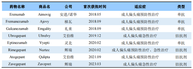 2018年以來,已有多款靶向降鈣素基因相關肽(CGRP)或其受體的藥物獲批,用于偏頭痛的治療或預防,這標志著偏頭痛治療新時代的到來。與傳統(tǒng)療法相比,CGRP相關療法具有顯著的改進,它們特異性地作用于三叉神經(jīng)疼痛系統(tǒng),且很少或沒有不良反應。Ubrogepant等CGRP受體拮抗劑可以有效緩解偏頭痛的急性發(fā)作,而Eptinezumab、Fremanezumab和Erenumab等靶向CGRP或CALCRL的單克隆抗體可以有效預防偏頭痛發(fā)作。目前,全球已批準8款CGRP/CGRPR類偏頭痛藥物上市,國內(nèi)僅君實生物和博安生物有所布局。其中君實生物的CGRP單抗JS010于2022年12月30日申報臨床。隨著患者需求不斷提高及創(chuàng)新藥物相繼面世的推動下,預計2024年偏頭痛領域市場規(guī)??沙?10億美元,未來CGRP類藥物市場空間潛力巨大。