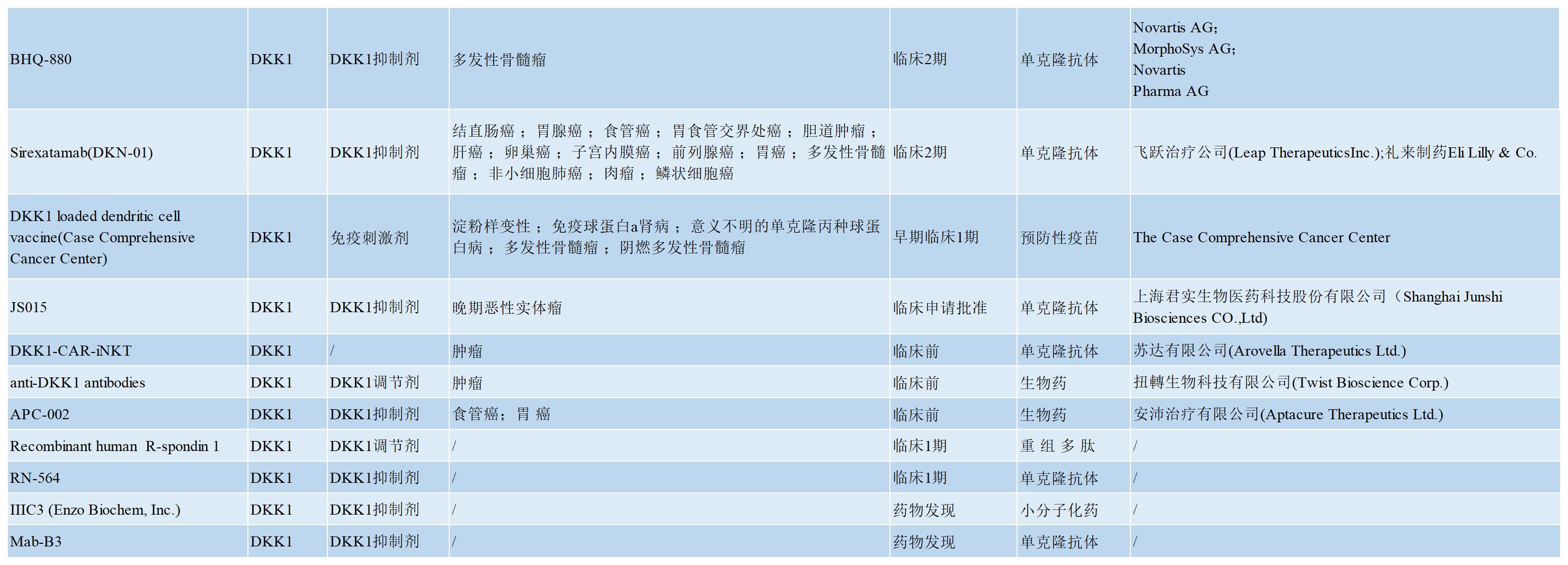 DKK1具有調(diào)節(jié)免疫的特性,它對免疫系統(tǒng)的抑制作用使其成為免疫治療的一個有前景的靶點。此前,Leap Therapeutics開發(fā)了抗DKK1中和抗體DKN-01并在晚期胃食管交界處和胃癌癥(GEJ/GC)以及婦科癌癥的I期或II期試驗中進行了評估,其方案包括與紫杉醇或pembrolizumab的單藥治療和聯(lián)合治療比較,值得注意的是,患有Wnt信號突變的婦科癌癥患者可以從DKN-01治療中獲益。GEJ/GC的另一項正在進行的臨床研究也表明,在腫瘤表達高水平DKK1(DKK1高)的患者中生存率和客觀反應結(jié)果都有所提高;非常令人鼓舞的結(jié)果表明,DKN-01加Keytruda治療可使中位無進展生存期(PFS)超過22周,中位總生存期(OS)接近32周,在既往未接受抗PD-1/PD-L1治療的DKK1高GEJ/GC患者中,ORR為50%,疾病控制率(DCR)為80%;在對PD-1/PD-L1治療難治的6名GEJ/GC患者中,3名血清DKK1水平高的患者病情穩(wěn)定,而3名血清DKK1水平低的患者病情則發(fā)生進展。這些結(jié)果表明,DKK1抑制治療顯著改善了血清DKK1水平高的患者的療效,并由此得出在DKK1高表達腫瘤患者中使用DKK1抑制劑和PD1/PDL-1免疫檢查點聯(lián)合治療的方案是一種獲得更好療效的策略。目前已有多個DKK1抑制劑處于研發(fā)階段,其中多數(shù)為DKK1的中和抗體,也有少量的小分子及重組多肽,小核酸藥物等( 如下表所示)。