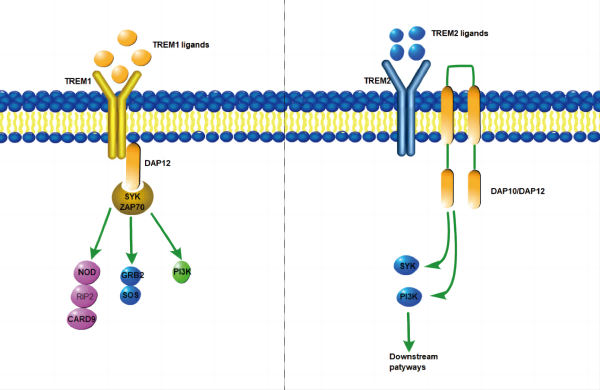 TREM(Triggering receptor expressed on myeloid cells)家族屬于細胞表面受體,介導(dǎo)調(diào)控炎癥反應(yīng)。TREM1屬于髓系細胞表面受體,在多種腫瘤微環(huán)境中均表達,協(xié)同經(jīng)典的模式識別受體(PRR),例如Toll-like受體(TLR)家族和Nod-like受體(NLR)家族,在宿主防御中放大由微生物成分介導(dǎo)的炎癥反應(yīng),具有抗腫瘤的作用。TREM2(Triggering receptor expressed on myeloid cells-2)是免疫球蛋白超家族的跨膜受體,僅在中樞神經(jīng)系統(tǒng)(CNS)的小膠質(zhì)細胞等骨髓細胞中表達。TREM2有多種配體,主要有APOE, HDL, LDL以及Aβ等。TREM2通過其與接頭蛋白DAP12和DAP10的關(guān)聯(lián)發(fā)出信號。DAP12是參與先天免疫應(yīng)答的細胞中表達的信號傳導(dǎo)銜接蛋白,介導(dǎo)脾酪氨酸激酶SYK的激活,DAP12促進質(zhì)膜上TREM2的穩(wěn)定,可以調(diào)控細胞的增殖,生存以及炎癥等信號通路。TREM2還可以結(jié)合DAP10,而DAP10通過招募磷脂酰肌醇3-激酶(PI3K)促進信號傳導(dǎo)。